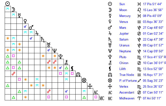 | Moon | 15 Leo 34 | 13 Cancer 43 | 20 Scorpio 38 |