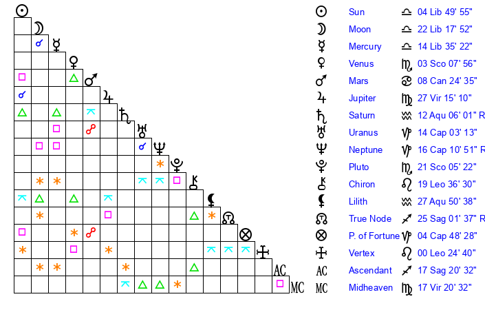| Sun | 4 Libra 50 | 4 Libra 50 | 7 Scorpio 31 |