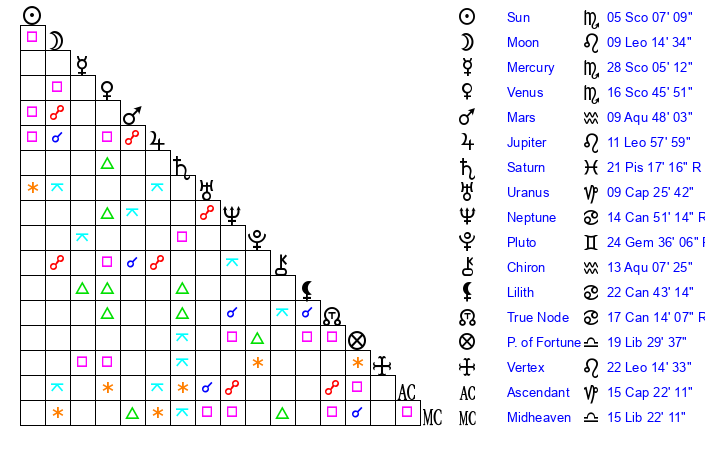 | Moon | 9 Leo 14 | 6 Aquarius 51 | 29 Scorpio 18 |
