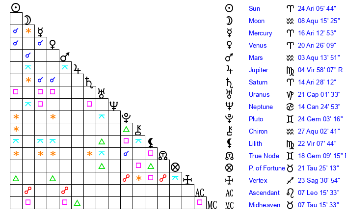 | Sun | 24 Aries 6 | 25 Aries 0 | 15 Leo 28 |