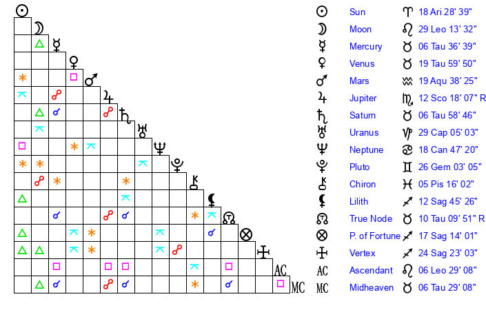 | Sun | 18 Aries 29 | 19 Aries 51 | 8 Leo 4 |