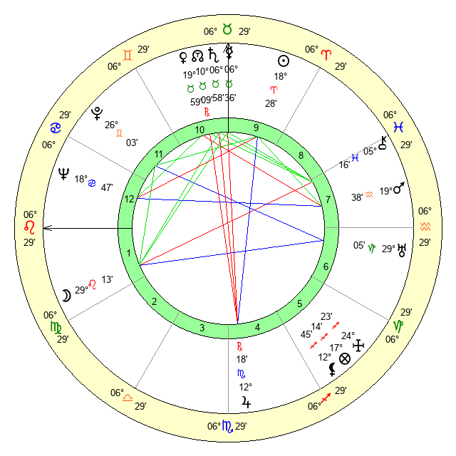 | Moon | 29 Leo 16 | 10 Virgo 47 | 2 Scorpio 22 |