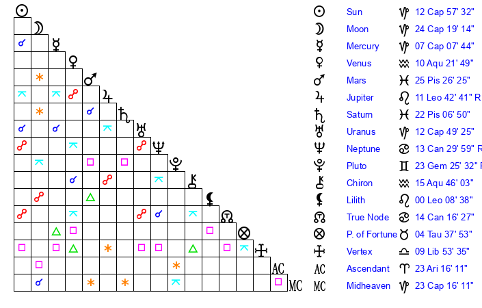 | Moon | 24 Capricorn 13 | 14 Pisces 47 | 10 Taurus 37 |