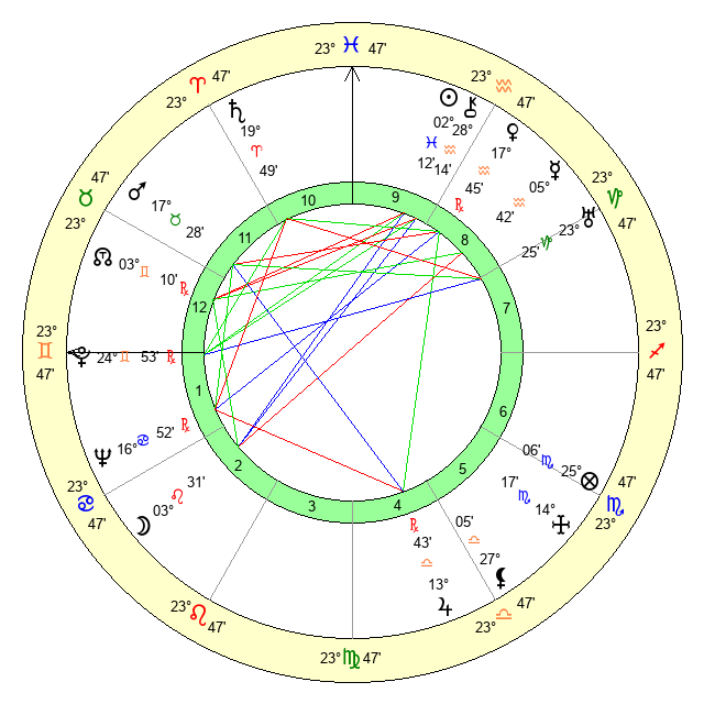 | Sun | 2 Pisces 12 | 3 Pisces 19 | 24 Gemini 38 |