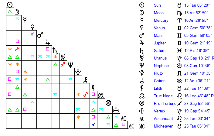 | Sun | 13 Taurus 4 | 14 Taurus 14 | 7 Virgo 7 |