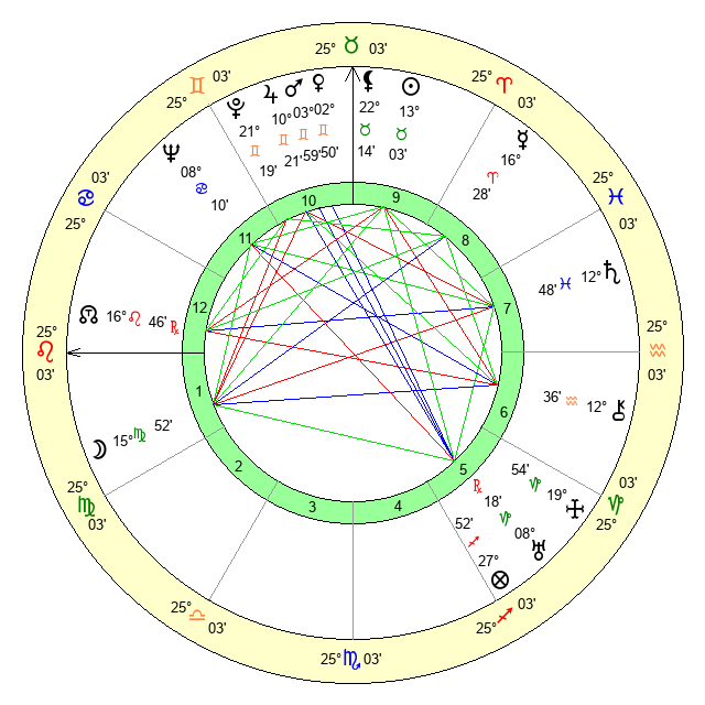 | Moon | 15 Virgo 54 | 12 Leo 56 | 5 Aquarius 9 |