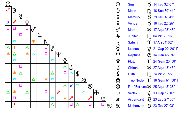 | Sun | 14 Taurus 32 | 15 Taurus 27 | 5 Virgo 41 |