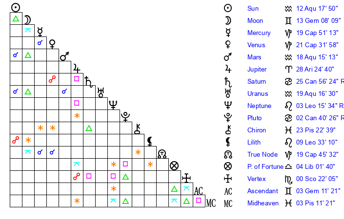 | Sun | 12 Aquarius 17 | 13 Aquarius 5 | 29 Taurus 4 |