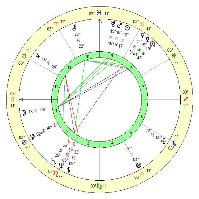 | Moon | 13 Gemini 9 | 25 Pisces 0 | 24 Taurus 57 |