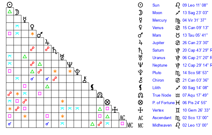 | Pluto | 14 Scorpio 59 | 2 Aquarius 24 | 15 Scorpio 27 |