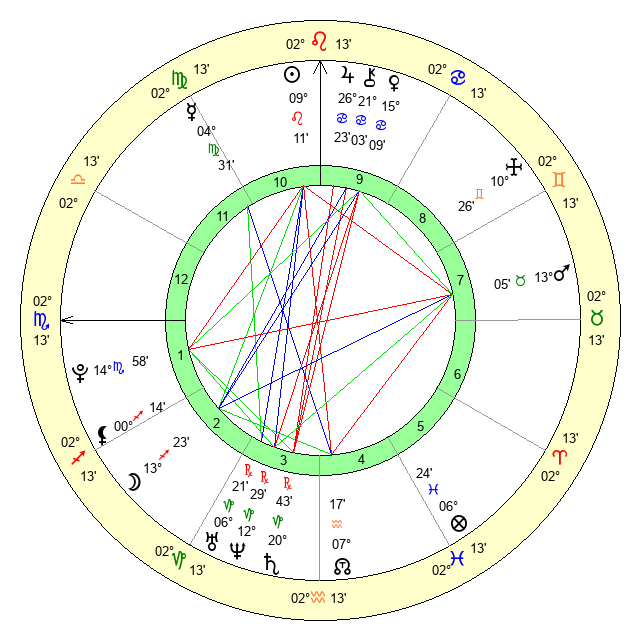 | Mercury | 4 Virgo 31 | 8 Leo 28 | 17 Virgo 39 |