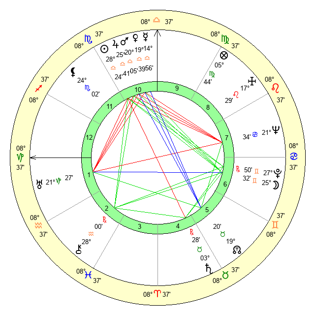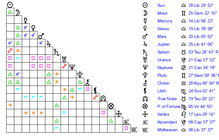 | Sun | 28 Libra 25 | 29 Libra 33 | 24 Aquarius 54 |