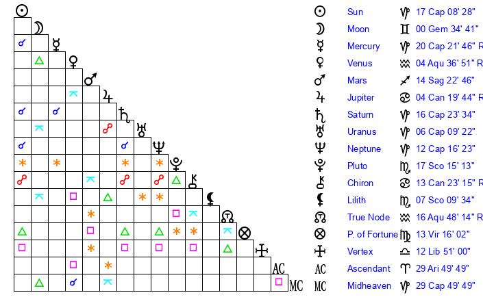 | Moon | 0 Gemini 45 | 27 Aries 1 | 15 Virgo 15 |