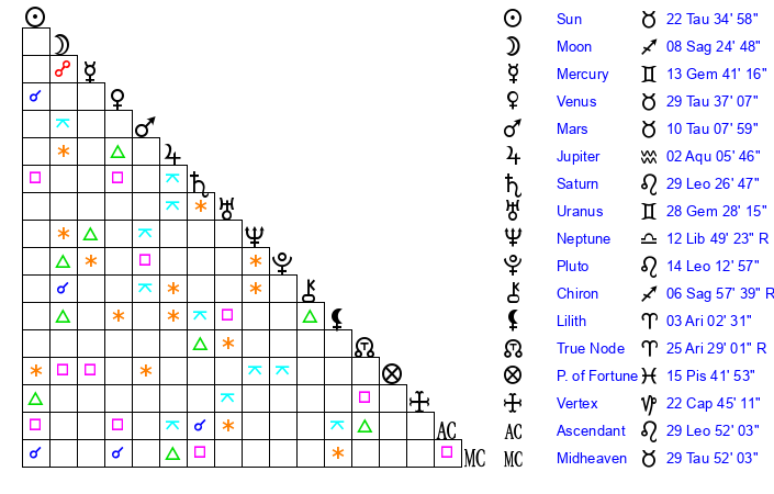 | Sun | 22 Taurus 35 | 23 Taurus 11 | 5 Leo 16 |