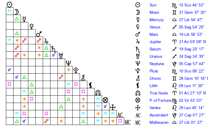 | Pluto | 10 Scorpio 8 | 1 Aquarius 31 | 11 Scorpio 33 |