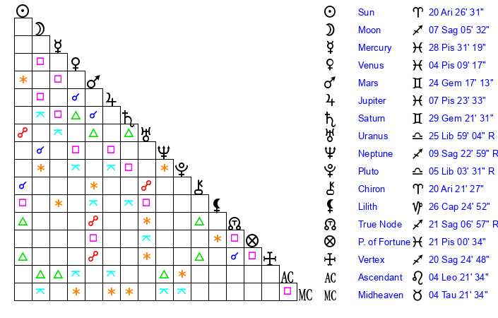 | Sun | 20 Aries 26 | 21 Aries 4 | 9 Gemini 51 |