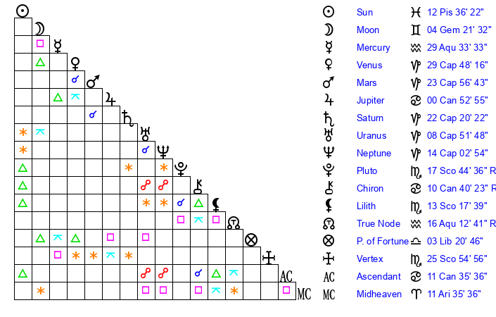 | Saturn | 22 Capricorn 23 | 20 Pisces 55 | 24 Capricorn 45 |
