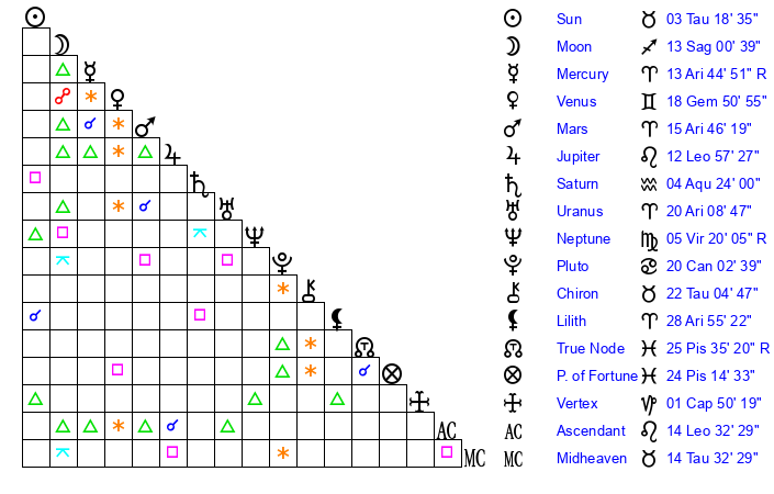 | Sun | 3 Taurus 19 | 3 Taurus 47 | 2 Leo 30 |