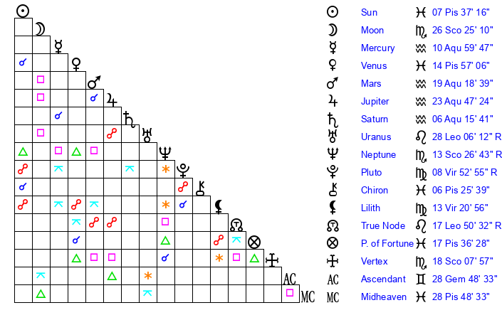 | Venus | 14 Pisces 58 | 10 Aries 37 | 2 Gemini 50 |