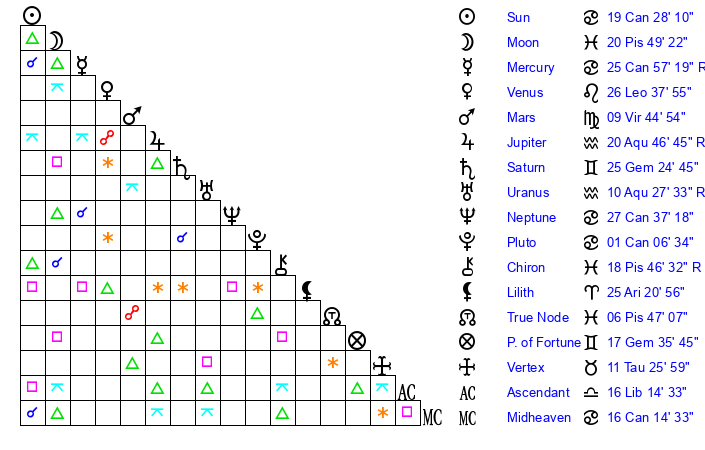 | Jupiter | 20 Aquarius 26 | 7 Cancer 28 | 12 Aquarius 58 |