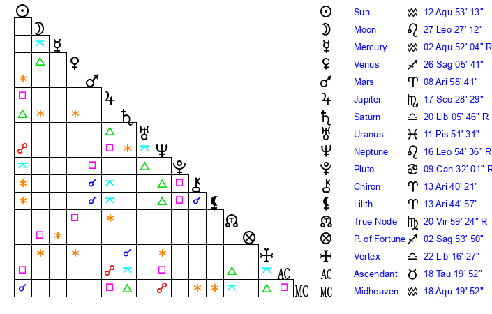 Sun | 12 Aquarius 53 | 14 Aquarius 9 | 23 Taurus 52 |