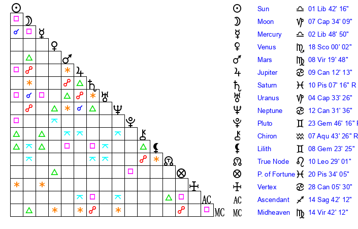 | Venus | 18 Scorpio 0 | 7 Virgo 34 | 16 Sagittarius 8 |