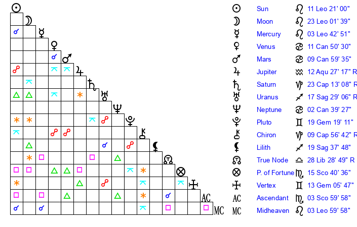 | Sun | 11 Leo 21 | 12 Leo 34 | 12 Sagittarius 38 |