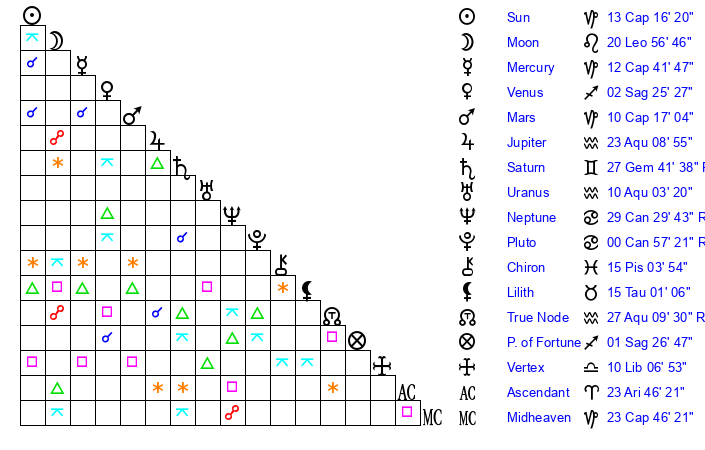 | Moon | 20 Leo 57 | 14 Pisces 47 | 27 Leo 48 |
