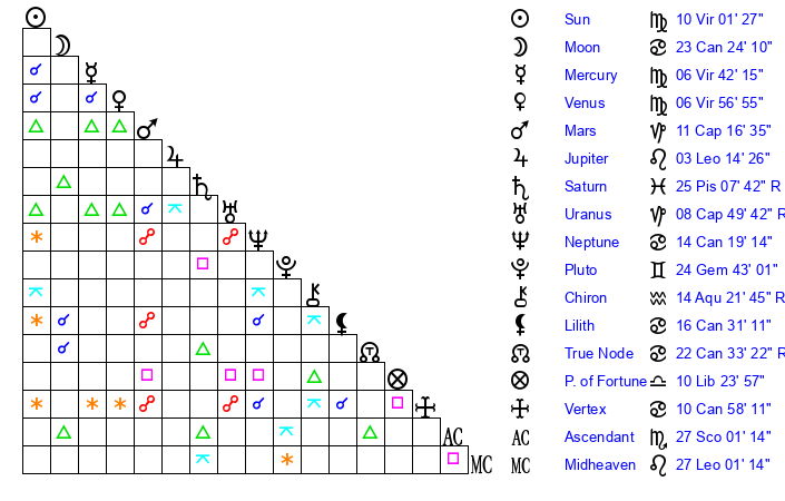 | Sun | 10 Virgo 2 | 11 Virgo 27 | 7 Capricorn 52 |