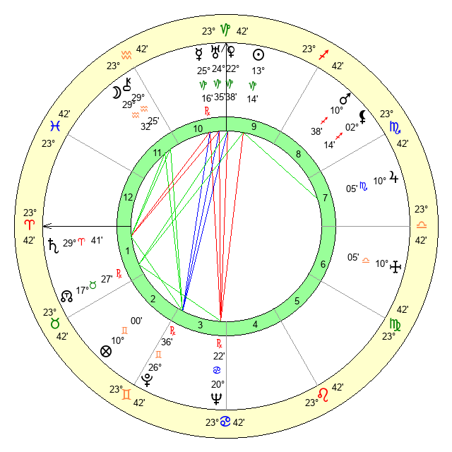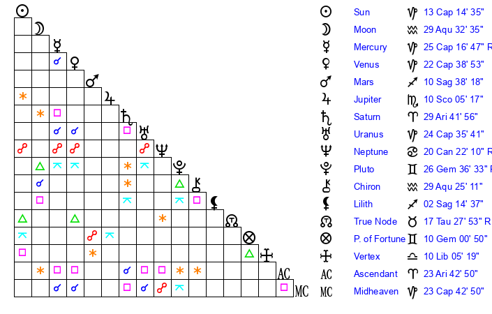 | Venus | 22 Capricorn 39 | 1 Pisces 39 | 12 Gemini 59 |