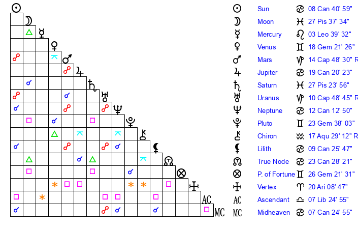 | Moon | 27 Pisces 42 | 27 Virgo 56 | 15 Cancer 41 |