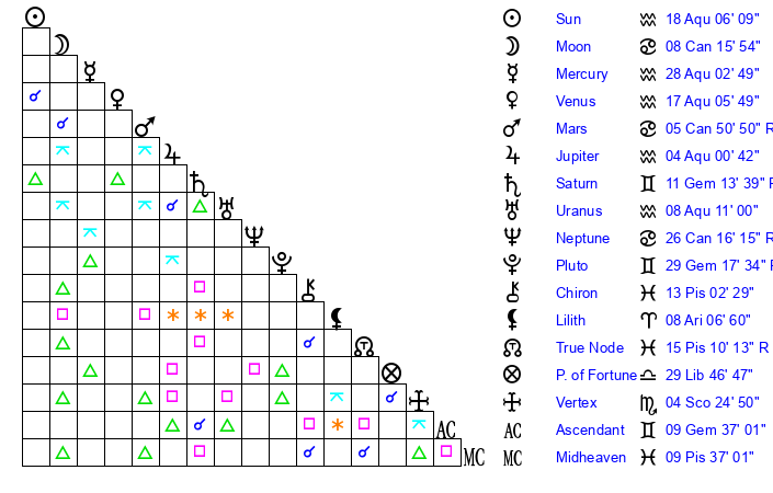 | Sun | 18 Aquarius 6 | 19 Aquarius 10 | 7 Gemini 27 |