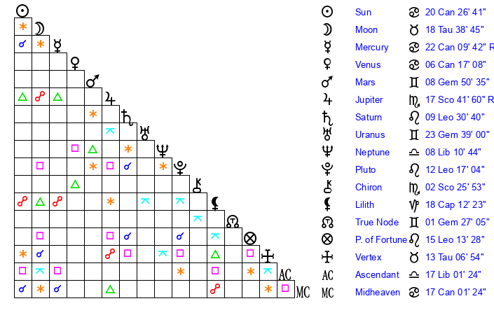 | Jupiter | 17 Scorpio 34 | 7 Cancer 42 | 25 Scorpio 10 |