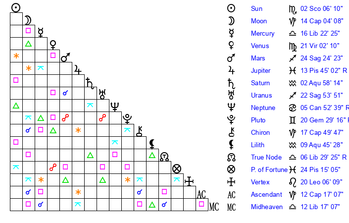 | Mercury | 16 Libra 23 | 27 Scorpio 2 | 13 Aquarius 37 |