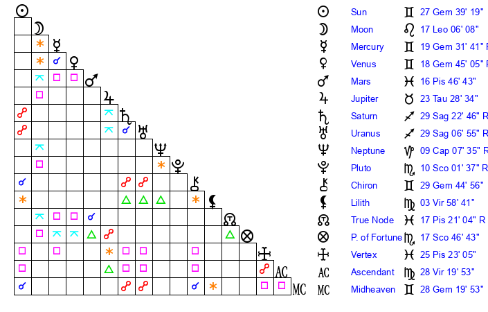 | Sun | 27 Gemini 39 | 27 Gemini 42 | 2 Leo 57 |