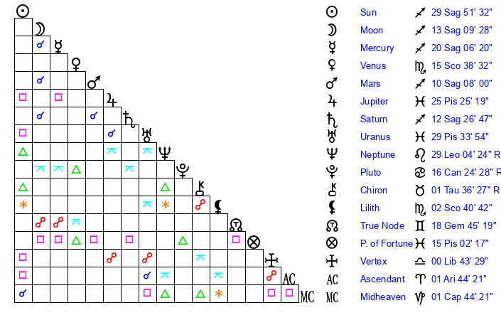 | Sun | 29 Sagittarius 52 | 1 Capricorn 21 | 7 Aries 46 |