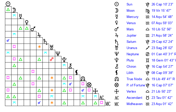 | Moon | 19 Virgo 9 | 9 Virgo 25 | 25 Aquarius 8 |