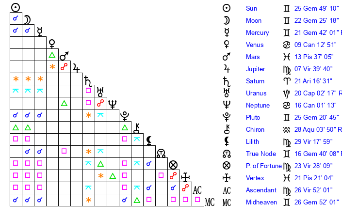| Sun | 25 Gemini 50 | 26 Gemini 45 | 17 Libra 44 |