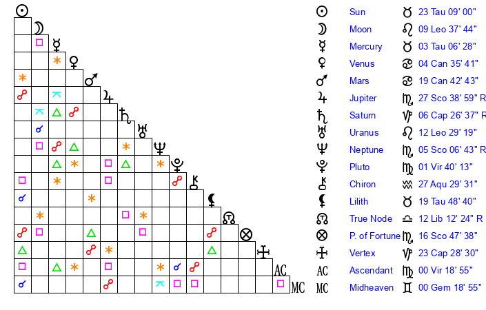 | Sun | 23 Taurus 9 | 24 Taurus 9 | 26 Cancer 16 |