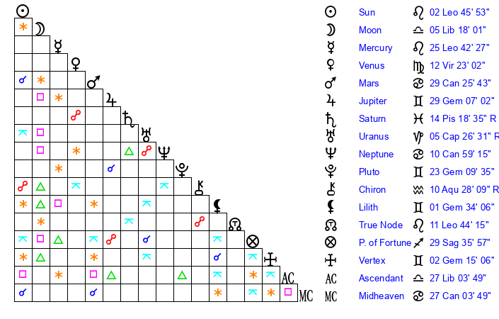 | Mercury | 25 Leo 42 | 12 Leo 45 | 14 Sagittarius 53 |