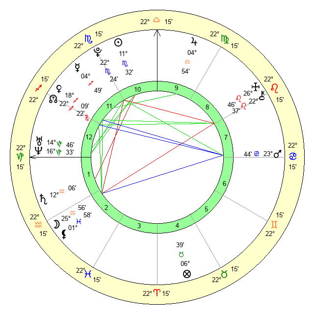 | Mars | 23 Cancer 43 | 29 Scorpio 24 | 27 Cancer 11 |