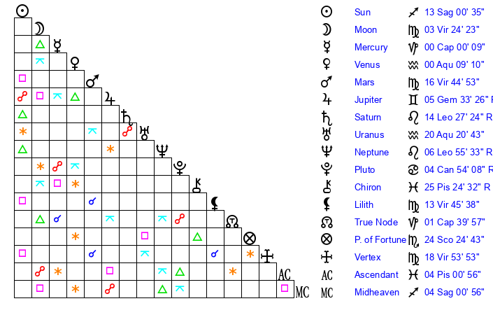 | Moon | 3 Virgo 24 | 7 Aquarius 0 | 7 Leo 13 |