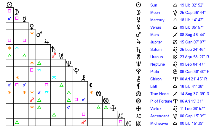 Sun | 19 Libra 32 | 20 Libra 36 | 7 Aquarius 44 |