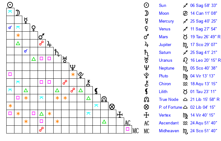 | Sun | 6 Sagittarius 58 | 7 Sagittarius 43 | 15 Aquarius 8 |