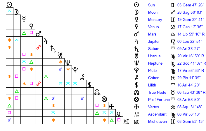 | Neptune | 22 Scorpio 41 | 1 Aries 44 | 21 Scorpio 37 |
