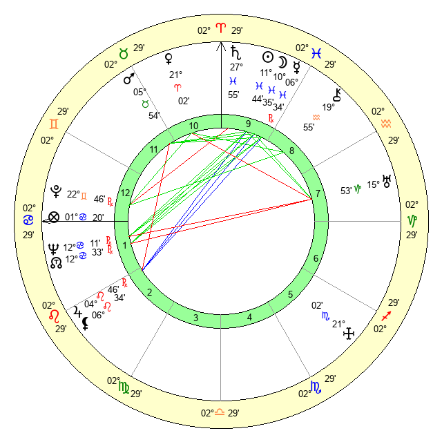 | Sun | 11 Pisces 44 | 12 Pisces 22 | 5 Cancer 36 |