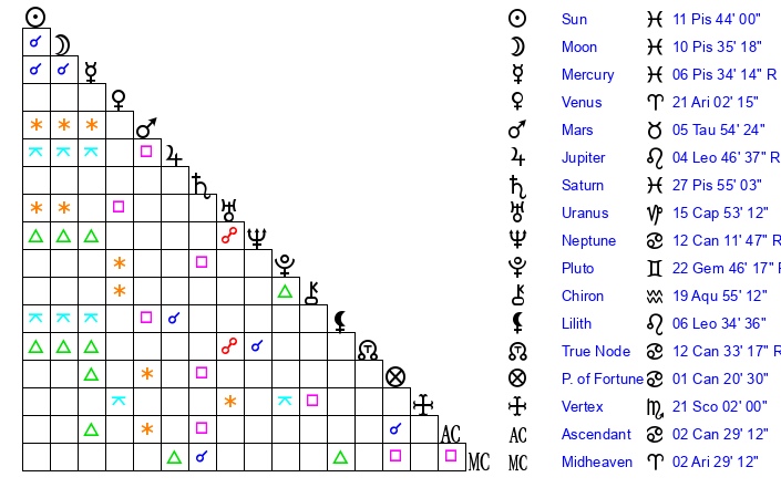 | Sun | 11 Pisces 44 | 12 Pisces 22 | 5 Cancer 36 |