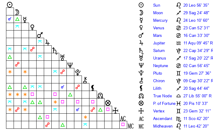 | Mercury | 24 Leo 11 | 4 Leo 55 | 24 Sagittarius 36 |