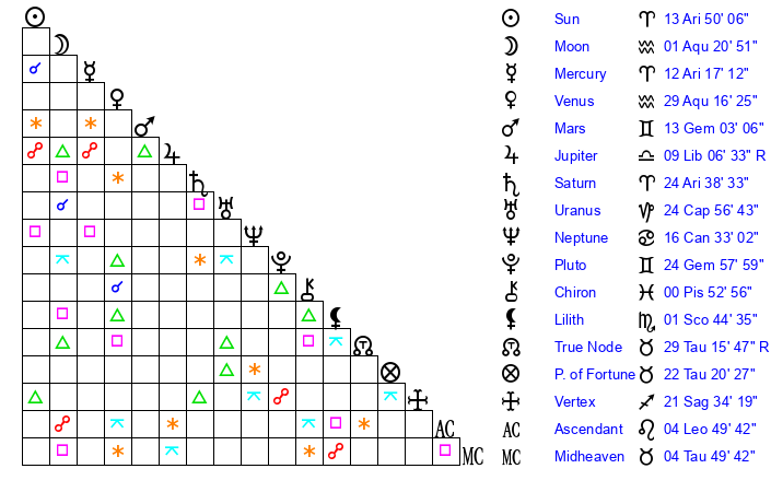 | Sun | 13 Aries 50 | 14 Aries 58 | 4 Leo 31 |