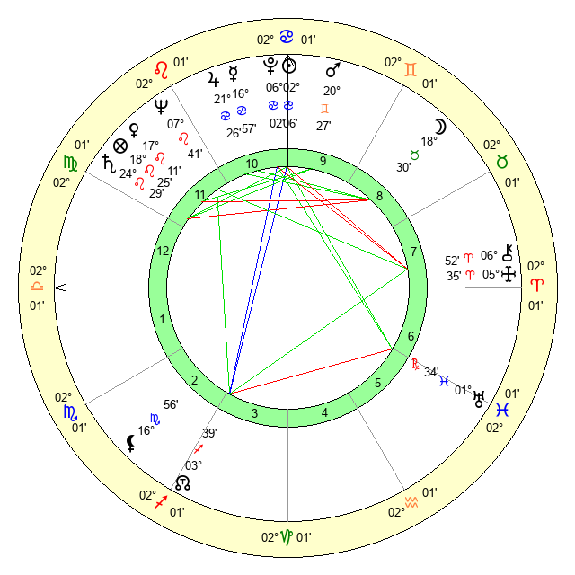 Sun | 2 Cancer 6 | 3 Cancer 26 | 14 Libra 21 |